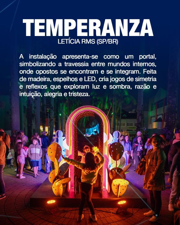 A instalação apresenta-se como um portal, simbolizando a travessia entre mundos internos, onde opostos se encontram e se integram. Feita de madeira, espelhos e LED, cria jogos de simetria e reflexos que exploram luz e sombra, razão e intuição, alegria e tristeza.