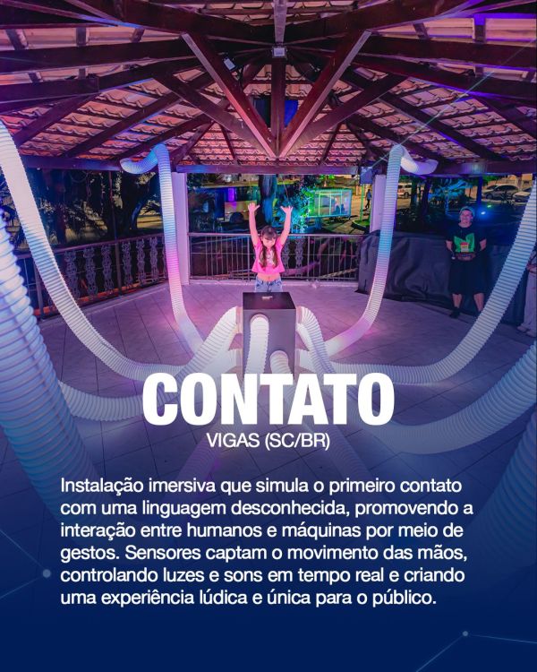 Instalação imersiva que simula o primero contato com uma linguagem desconhecida, promovendo a interação entre humanos e máquinas por mio de gestos. Sensores captam o movimento das mãos, controlando luzes e sons em tempo real e criando uma experiência lúdica e única para o público.