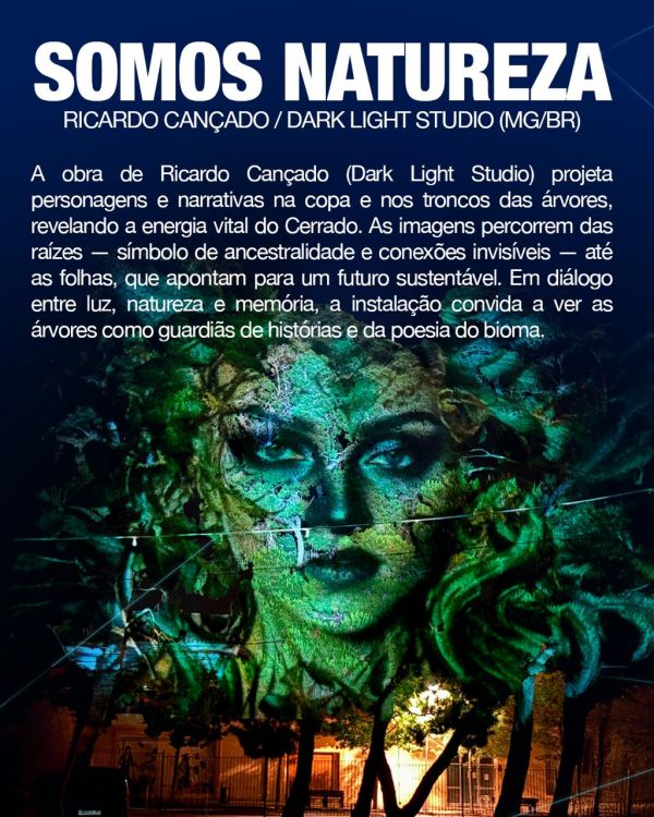 A obra de Ricardo Cançado (Dark Light Studio) projeta personagens e narrativas na copa e nos troncos das árvores, revelando a energia vital do Cerrado. As imagens percorrem das raízes – símbolo de ancestralidade e conexões invisíveis – até as folhas, que apontam para um futuro sustentável. Em diálogo entre luz, natureza e memória, a instalação convida a ver as árvores como guardiàs de histórias e da poesia do bioma.
