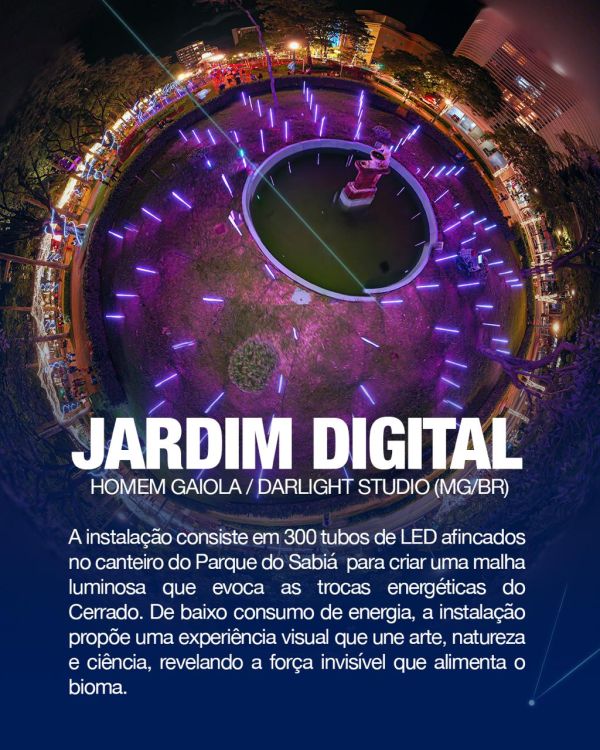 Entre os dias 11 e 13 de setembro, o Parque do Sabiá será o palco para estas instalações de luz. Uma proposta inédita no festival, que contará com 6 instalações, em formatos que vão de projeções até esculturas interativas, e ocupará uma área de 1000m2 do Parque.