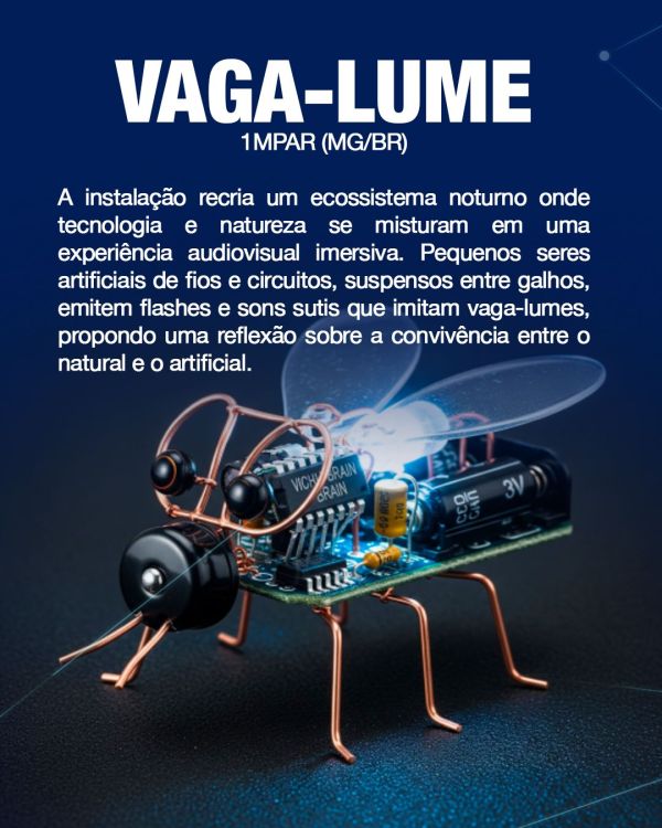 A instalação recria um ecosistema notumo onde tecnologia e natureza se misturam em uma experiência audiovisual imersiva. Pequenos seres artificiais de fios e circuitos, suspensos entre galhos, emitem flashes e sons sutis que imitam vaga-lumes, propondo uma reflexão sobre a convivência entre o natural e o artificial.